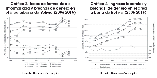 Siguiendo a las Naciones Unidas (2015), la elección del empleo informal es una estrategia de supervivencia que no sólo se vincula a las insuficientes oportunidades de trabajo formal y a la fallas del sistema de protección social y de legislaciones laborales, sino también al análisis de los costos y beneficios de ocupaciones formales dadas ciertas características y aspiraciones personales. Respecto a este último punto, en el área urbana de Bolivia el sector informal emerge como la mejor alternativa de muchas mujeres, al permitir compatibilizar sus responsabilidades reproductivas y domésticas con el trabajo mercantil. Esto no significa que el primer mejor de esta población sea el empleo informal, sino más bien refleja la existencia falencias sociales e institucionales que influyen en las oportunidades laborales de las mujeres.