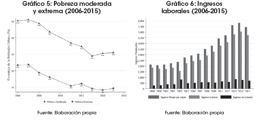 De forma paralela al comportamiento del mercado laboral descrito, se experimentaron tendencias decrecientes de la pobreza, alcanzando al 2013 niveles históricamente bajos en la pobreza moderada y extrema (gráfico 5). De acuerdo a Castellani y Zenteno (2015), dentro de los factores que favorecieron a estas tendencias, tanto en el área rural como urbana del país, resalta el desempeño macroeconómico que respondió al contexto económico favorable y a las medidas redistributivas de los ingresos.