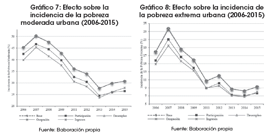 Como se aprecia en el primer caso, el mayor efecto en la simulación se dio en 2007, con una disminución en la pobreza extrema en 4.25p.p., frente a una variación mínima del indicador en 2015, con una disminución en este indicador de 1.31 p.p.. En el caso de la participación laboral, el mayor efecto corresponde a 2007, con una disminución de la pobreza extrema de 2.65 p.p., mientras que el menor efecto corresponde a 2014, con una disminución de 1.16 p.p. El contraste entre ambos efectos se aprecia en el gráfico 8.