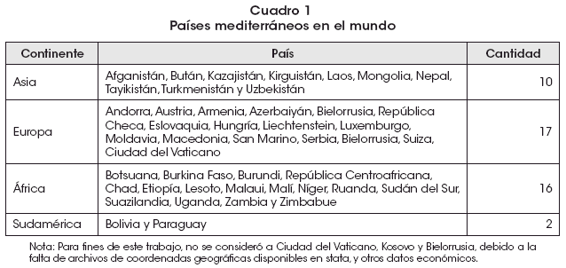 1 Cabe aclarar que la definición de mediterraneidad en este documento hace referencia a un Estado sin salida al mar, y no acoge la condición de “estar en medio de tierras”, como es usualmente interpretado en Europa para hacer referencia al grupo de países europeos que comparten la costa del Mar Mediterráneo.
