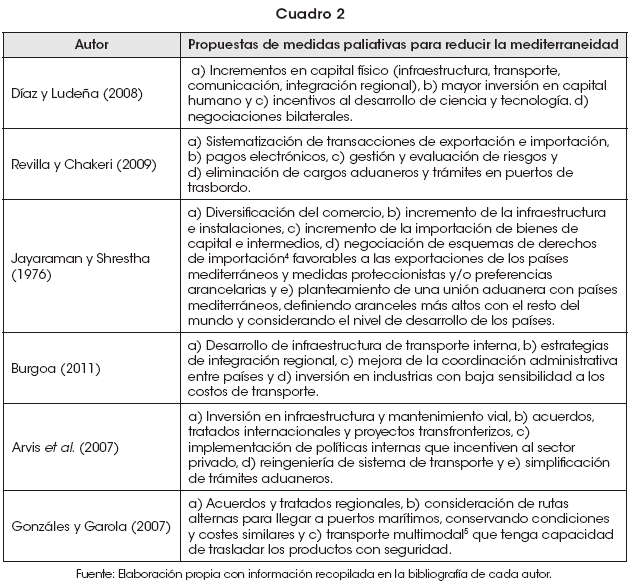 Frente a la mediterraneidad, varios autores han reaccionado de forma diversa. En este sentido, existen diferentes estrategias para mitigar los efectos negativos de la mediterraneidad, como ser: a) inversión en infraestructura logística y de transporte, b) celebración de acuerdos comerciales preferenciales y áreas de aranceles comunes y c) gestiones para la minimización de costos de tramitación y mejoras en el sistema de tránsito. A continuación, se presenta el Cuadro 2, en el cual se resumen las ideas más representativas.