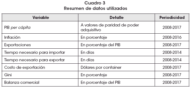 La información económica para este documento fue recabada casi en su totalidad de una misma fuente, el Banco Mundial, salvo muy contados datos específicos de algún país, para lo que se recurrió a la Agencia Central de Inteligencia de los Estados Unidos (CDI). Considerando las restricciones de información, se consideró prudente trabajar con promedios históricos en lugar de series enteras, específicamente para los años 2008-2017. Más que una justificación, este criterio se respalda en el hecho de que la mediterraneidad es un condicionante estructural que no cambia de año en año; consecuentemente, su relación de causa y efecto es persistente en el tiempo. A continuación, se detallan las variables económicas utilizadas: