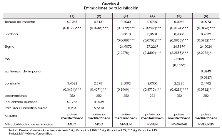 En el Cuadro 4 se observa que el tiempo de demora para importar tiene una relación directa y significativa con la inflación doméstica, tanto para países mediterráneos (especificación 1) como no mediterráneos (especificación 2). No obstante, el efecto sobre los países mediterráneos es ligeramente superior. Por cada 9 horas de retraso adicionales en el tiempo de importación, es decir, 1 % más, la inflación se incrementa en 0.13%.