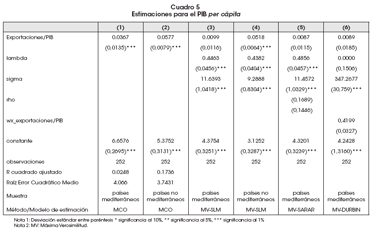 Cuando se incorpora dependencia espacial en la especificación, las exportaciones explican mejor la renta per cápita para países no mediterráneos (ecuación 4). El aumento de las exportaciones sobre el PIB en 1% incrementa el PIB per cápita en cerca de 0.5% explicado por su efecto directo.