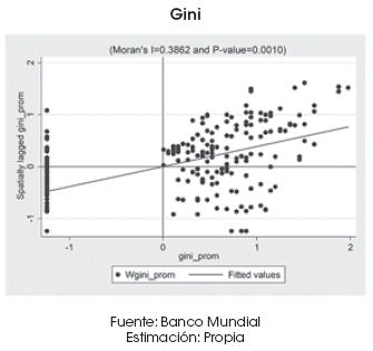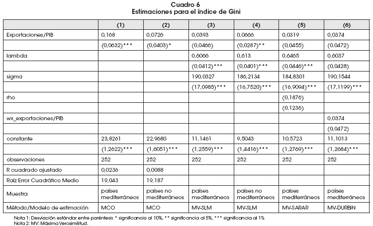 Las ecuaciones (1) y (2) estiman el efecto del valor de las exportaciones en términos del PIB respecto al coeficiente de desigualdad de Gini para economías mediterráneas y no mediterráneas. Un aumento de 1% en las exportaciones repercute positivamente en la concentración del ingreso8, aunque levemente (0.17% para países mediterráneos y 0.07% para países no mediterráneos). Cuando se introducen efectos espaciales (modelo SLM), la regresión para economías mediterráneas deja de ser significativa, mientras que para países no mediterráneos la incorporación de dependencia espacial mantuvo la relación de significancia entre las exportaciones y el coeficiente de Gini. Esta relación de dependencia espacial para países costeros muestra que la desigualdad asociada a las mayores exportaciones se retroalimenta en países vecinos que también son costeros.