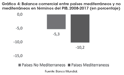 La mayoría de los países mediterráneos se caracterizan por ser economías pequeñas y abiertas, orientadas a la exportación de productos básicos, tomadoras de precios internacionales, sensibles a los términos de intercambio, con gran concentración comercial y dependientes de un tercer país para exportar sus productos a ultramar, lo que resulta en una débil capacidad de negociación con su socio comercial. De esta manera, un acrónimo útil para caracterizar a este grupo de países podría ser el de EMPA (Economía Mediterránea Pequeña y Abierta).