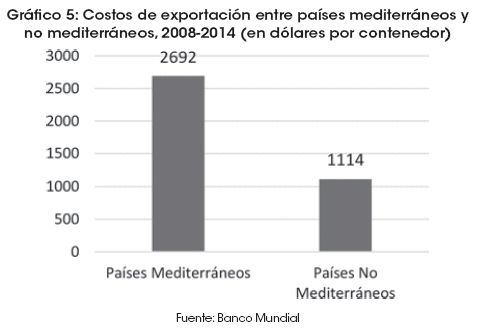 Entre 2008 y 2014, en el mundo el tiempo promedio de exportación para un país mediterráneo llegó a 38 días, mientras que un país no mediterráneo lo hacía en sólo 19. En cuanto a las importaciones, la demora es aún mayor. Los países mediterráneos tardaban 43 días en importar su mercadería mientras que los países costeros lo hacían en 21 días.