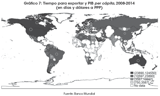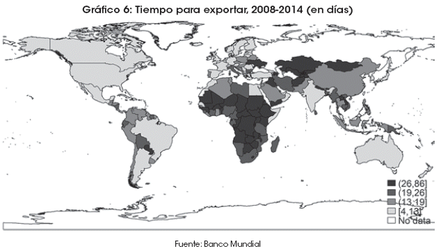 Es así que los países africanos y de Asia Central aparecen como los que más tiempo demoran en exportar; entre ellos, los países enclaustrados son los que mayor desviación (círculos rellenos) presentan. Del otro lado se ubican la mayoría de los países europeos y americanos que tienen los menores tiempos de exportación (círculos huecos). En Sudamérica, Paraguay posee el mayor tiempo de exportación, seguido de Bolivia, país que, si bien está ligeramente por debajo de la media mundial, muestra una demora mucho mayor con relación al resto de países vecinos.