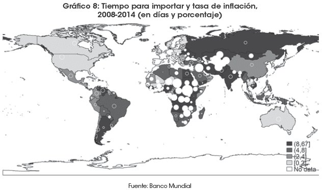 En el Gráfico 8, los países con mayor inflación aparecen pintados de color azul oscuro y los de menor inflación con color celeste. En círculos rellenos se pintan los países que demandan mayor tiempo para importar y en círculos huecos se encuentran los que tienen menor demora. Se observa nítidamente que los países mediterráneos de Europa del Este, Asia Central, África y Sudamérica presentan la mayor desviación en retraso con respecto a la media mundial, mientras que los países costeros en su gran mayoría presentan valores bajos en tiempo de importación. De nuevo, se denota una correlación espacial entre los países mediterráneos con mayor tiempo para importar (círculos rellenos grandes) y las más altas tasas inflacionarias (regiones azules oscuras), salvo marcadas excepciones, como los casos de Venezuela, Argentina, Rusia, India e Irán, entre los más importantes, cuyos procesos inflacionarios responden a factores distintos a la mediterraneidad.