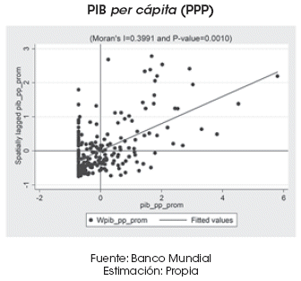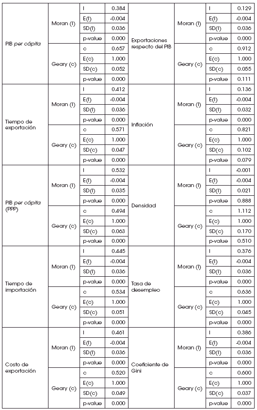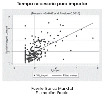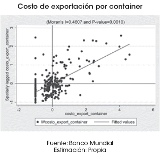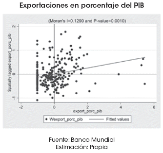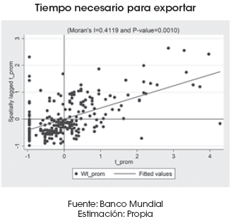 En consecuencia, puede apreciarse un patrón de agrupamiento espacial inequívoco. En general, países menos eficientes en el tiempo dedicado a la exportación de sus mercancías presentan PIB per cápita más bajos, mientras que países con menor tiempo de exportación alcanzan mayores rentas por habitante.