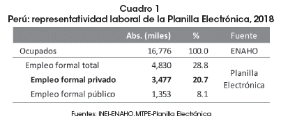 Por ejemplo, en base a la Encuesta Nacional de Hogares (ENAHO), bajo la metodología del Instituto Nacional de Estadística e Informática (INEI, 2018), el empleo formal nacional representó el 27.6% de 16.8 millones de ocupados. Según las definiciones del Banco Mundial (BM) y del Banco Interamericano de Desarrollo (BID), el porcentaje de trabajadores formales fue de 30.2% (definición legal) y 32.6% (definición productiva), mientras que para el Ministerio de Trabajo y Promoción del Empleo (MTPE), la formalización laboral asalariada privada ascendió a 44.6%. Para el mismo periodo, los datos de la Planilla Electrónica del MTPE revelan que cerca de 3.5 millones de trabajadores fueron registrados en empresas formales del sector privado, lo que representó el 20.7% de la población ocupada (Cuadro 1).