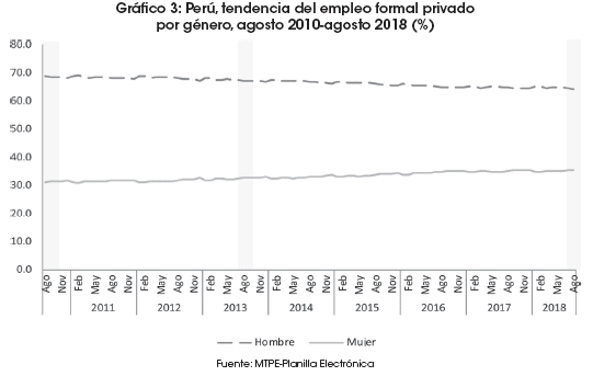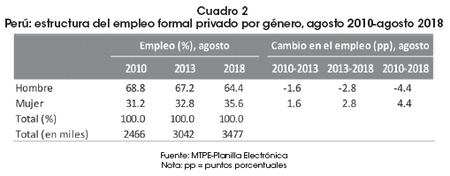 Durante este periodo las estructuras del empleo formal por género casi no han cambiado; no obstante, se destaca un importante aumento en el porcentaje del empleo femenino, de 4.4 puntos porcentuales, entre agosto 2010 y agosto 2018, siendo mayor el incremento registrado en los últimos seis años. A agosto de 2018, el 64.4% del total del empleo formal privado estuvo conformado por hombres, mientras que el resto (35.6%) fue ocupado por mujeres (Cuadro 2).