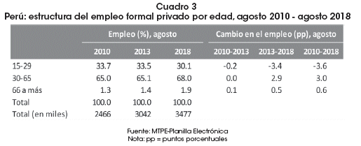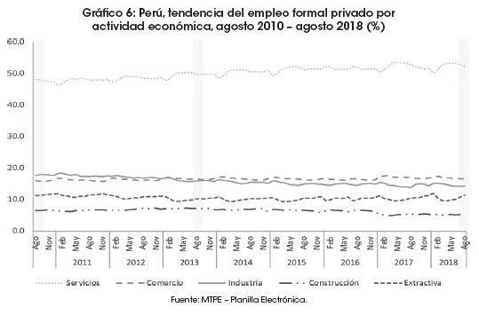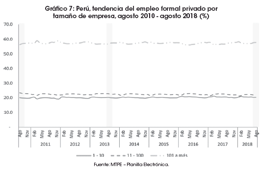 Por ende, en estos últimos ocho años, las estructuras del empleo formal del sector privado por género, edad, nivel educativo, actividad económica y tamaño de empresa se mantuvieron sin mayores cambios significativos. A pesar de ello, la radiografía más actual de la formalización indicaría que, según datos de la Planilla Electrónica a agosto de 2018, el empleo formal registrado por el sector privado tuvo rostro masculino (64.4%), predominó en adultos de 30 a más años de edad (69.9%), se caracterizó por estar presente en trabajadores de bajo nivel educativo (51.3% contó con educación hasta secundaria), con elevada concentración en las actividades terciarias de servicios (52.3%) y comercio (16.7%), principalmente, en empresas de 101 a más trabajadores (57.8%).