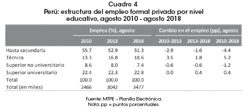 En términos de estructuras educacionales, las variaciones más significativas se han registrado en aquellos trabajadores con menor calificación. En efecto, entre agosto 2010 y agosto 2013, se registró una reducción de 2.9 puntos porcentuales en la proporción de ocupados que tenían hasta secundaria, y un incremento de 3.5 puntos porcentuales en el grupo de trabajadores técnicos. A agosto de 2018, el 51.3% de la mano de obra formal privada tenía hasta secundaria, 18.6% contaba con estudios técnicos, 7.4% tenía estudios no universitarios y 22.8% poseía estudios universitarios (Cuadro 4).