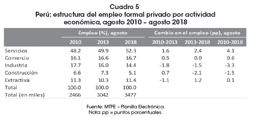 La información del Cuadro 5 revela que para la mayoría de sectores los cambios más sobresalientes en la estructura del empleo formal privado se presentaron, principalmente, entre agosto de 2013 y agosto de 2018. Ello ocasionó que, a agosto de 2018, el 52.3% de los trabajadores realicen labores en el sector servicios, seguido por el de comercio (16.7%), industria (14.4%), extractiva (11.4%) y construcción (5.1%).
