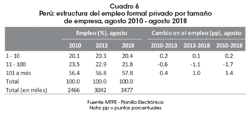 Durante el periodo comprendido entre agosto de 2010 y agosto de 2018, las variaciones más importantes en la proporción de trabajadores formales por tamaño de empresa se registraron en empresas de 11 a 100 y en empresas de 101 a más trabajadores, con cambios de -1.7 puntos porcentuales y 1.4 puntos porcentuales, respectivamente. A agosto de 2018, la mayor proporción de mano de obra privada formal (57.8%) se concentró en empresas de 101 a más trabajadores, seguidas en orden de importancia por empresas de 11 a 100 trabajadores (21.8%) y empresas de hasta 10 trabajadores (20.4%).