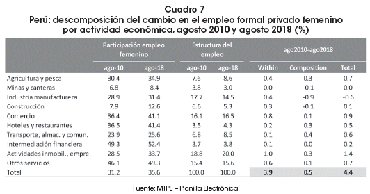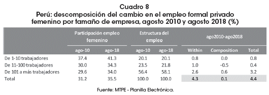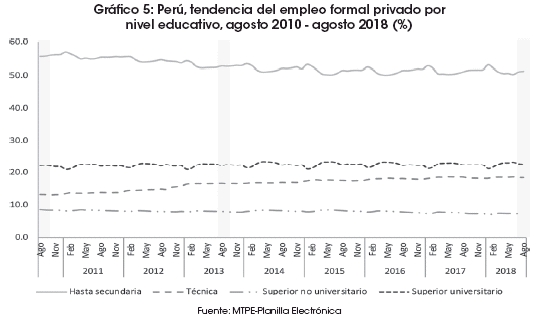 This document analyzes the trends and possible changes generated in the registered formal employment of the private sector, based on the information from the electronic form reported from August 2010 to August 2018. The evidence reveals that there are no significant changes in the trends and formal employment structures of the private sector. However, there was a reduction in the proportional employment gap in favor of women and a consolidation of the adult labor force aged 30 and over. More than 88% of the increase in female private formal employment was explained by intersectoral dynamism (effect within) and not by structural changes in the labor market. In most regions, the growth of private formal employment was mainly explained by the regional effect due to internal specialization and sectoral dynamism in the regions.