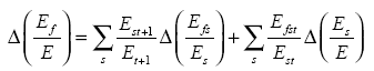 Donde E representa el número de personas empleadas, f es la categoría de análisis (mujer, hombre, joven, adulto, etc.), t es el tiempo, s los tipos de actividades o sectores económicos y Δ constituye los cambios entre el tiempo t y el tiempo t + 1. Por tanto, si quisiéramos representar la ecuación anterior en términos de la proporción del empleo femenino tendríamos que Efst sería el número total de mujeres empleadas en el sector s en el momento t. El primer término de la descomposición representa el impacto de los cambios en la propensión a emplear mujeres dentro de los sectores (efecto within), mientras que el segundo captura el impacto de los cambios en la estructura del empleo en todos los sectores (efecto composition).