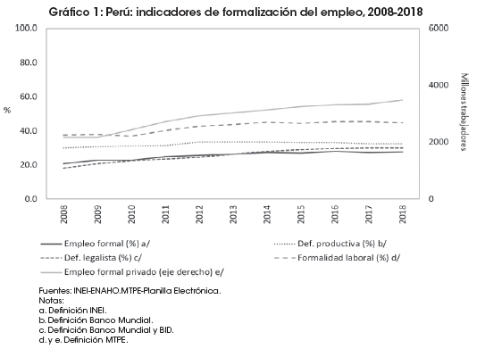 El mercado laboral peruano, caracterizado por presentar elevadas tasas de informalidad, en años recientes ha experimentado un leve crecimiento del empleo formal. Los resultados difieren según el método o criterio de estimación y la fuente de información utilizada para medir el empleo formal. En el Anexo 1 se describen las diferentes definiciones operativas para cuantificar la formalidad del empleo.