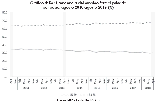 Las trayectorias del empleo formal privado por rangos de edad revelan una ligera disminución en el porcentaje de empleo de los jóvenes de 15 a 29 años de edad, y un incremento en el grupo de más de 30 años de edad. Es decir, a lo largo de los últimos ocho años, el empleo formal generado por el sector privado sigue siendo absorbido, principalmente, por personas adultas con más de 30 años de edad (Gráfico 4).