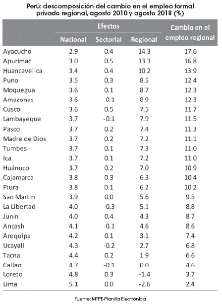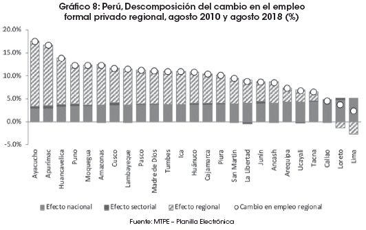 En cuanto al análisis regional clásico del Shift-Share, la evidencia señala que, entre agosto de 2010 y agosto de 2018, en 15 de 25 regiones (principalmente en el Sur) el empleo formal creció por encima de 10% en promedio mensual durante todo el periodo de análisis. En la mayoría de ellas el crecimiento del empleo formal registrado se explicó fundamentalmente por el efecto regional, es decir, generado por la especialización interna y el dinamismo sectorial de las regiones, en comparación con el dinamismo sectorial nacional, con excepción de Arequipa, Ucayali, Tacna, Callao, Loreto y Lima, donde predominó la relevancia del efecto nacional sobre el regional. Dado que el efecto sectorial fue muy pequeño -para este periodo de análisis y fuente de información utilizada- no hay espacio para hablar sobre la posibilidad de un cambio estructural en las regiones.