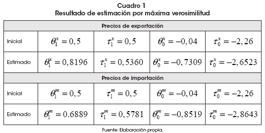 Se estima los parámetros del modelo de precios internacionales por el método de máxima verosimilitud y se hace uso del filtro de Kalman. El filtro de Kalman es un algoritmo matemático recursivo para computar el estado inobservable de un modelo estado espacio. Bajo el supuesto de distribución normal de las perturbaciones y el vector de estado inicial, permite construir la función de máxima verosimilitud del modelo a través de la descomposición del error de predicción. Sea yt una serie temporal de n elementos observados que están relacionados con el vector no observado ξt. Sea el modelo estado espacio definido como: