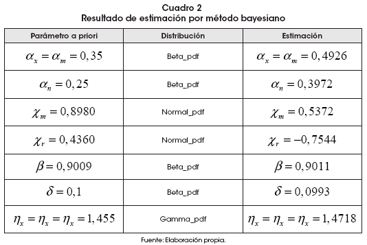 Respecto al submodelo exógeno, no existen valores a priori estimados debido a que los estados no observables que se utilizan para simular los shocks de persistencia y volatilidad no tienen datos disponibles. Asimismo, para este caso en particular, las distribuciones de probabilidad son desconocidas, por lo tanto, la mejor forma de estimarlas es a través del método de máxima verosimilitud3. En la segunda parte se utiliza la ventaja de contar con parámetros a priori ya estimados por Schmitt-Grohe y Uribe (2018) y distribuciones de probabilidad que ya se aplicaron en anteriores investigaciones para este tipo particular de parámetros. En esta parte se emplea la estimación bayesiana.