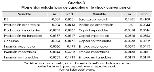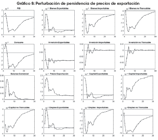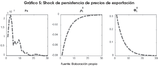 El efecto final es una perturbación convencional de precios de exportación acompañada de una variación en la persistencia. Como consecuencia, los precios de exportación se desvían positivamente del valor de estado estacionario; sin embargo, este cambio es menor con respecto al caso convencional, aunque más duradero. Nótese que la serie de precios de exportación convergen a partir del periodo 10, lo que implica que la duración del shock de persistencia es aproximadamente el doble con relación al caso 1, pero de menor magnitud.