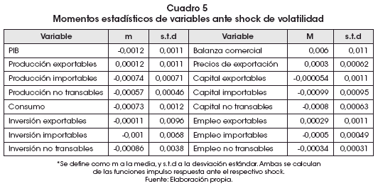 . El Gráfico 6 presenta la dinámica y mecanismos de transmisión de un shock de volatilidad a través de las funciones impulso respuesta a 20 periodos.