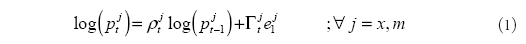 Schmitt-Grohe y Uribe (2018) sostienen que economías pequeñas y abiertas juegan un pequeño rol en la determinación de los precios de exportación e importación, y por ende sus términos de intercambio son exógenos. En ese sentido, se modelan los precios internacionales como procesos autorregresivos de primer orden representados por la siguiente ecuación2:
