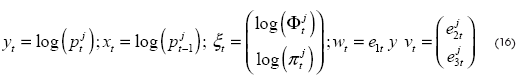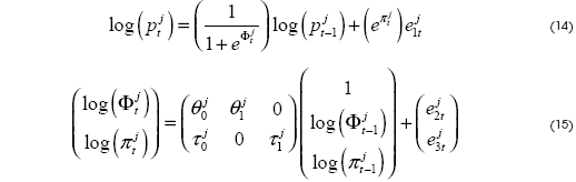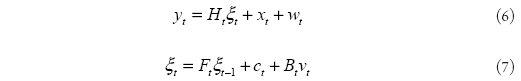 La expresión (6) se define como la ecuación de medida, donde Ht es una matriz de nxr elementos, xt es un vector de k × 1 y wt es un error con E(wt) = 0 y VAR(wt) = Rt . El estado no observado (7) se modela como un proceso de Markov denominado ecuación de transición, donde Ft es una matriz de tamaño r × r, ct un vector de r × 1, Bt es una matriz de m × g y vt es el error de tamaño g × 1 con E(vt) = 0 y VAR(vt) = Qt .