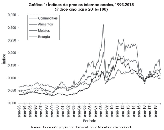 Como se puede ver en el gráfico 1, a partir del año 2000 se inicia una fase expansiva en los cuatro principales índices de precios internacionales1: commodities, alimentos, metales y energía. Este periodo se ha caracterizado por un boom de precios internacionales y un alto nivel de volatilidad. Fernández et al. (2018) han denominado al periodo mencionado como "the Commodities Roller Coaster" para caracterizar las importantes fluctuaciones en los precios internacionales.