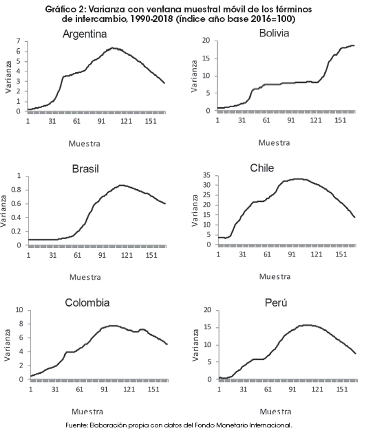 Con el fin de analizar el comportamiento de la volatilidad de los precios externos lo largo de estos años, se construye una serie temporal para la varianza a través de una ventana muestral móvil para los términos de intercambio de un conjunto de países Latinoamericanos seleccionados. El método consiste en calcular la varianza inicial para una submuestra de 180 datos de enero de 1990 a enero de 2005; posteriormente se mueve la muestra un mes en adelante y se vuelve a calcular con la nueva submuestra de febrero de 1990 a febrero de 2005, y así sucesivamente. De esta forma se obtiene el comportamiento de la varianza a lo largo del tiempo.