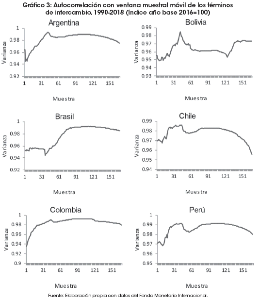 De la misma forma, se aplica el método de ventana muestral móvil a la autocorrelación de los términos de intercambio para Chile, Bolivia, Perú, Colombia, Argentina y Brasil, para ver el comportamiento de la persistencia de los precios externos en los años seleccionados. Se aplica el método de Ventana Muestral Móvil a la autocorrelación de los términos de intercambio para Chile, Bolivia, Perú, Colombia, Argentina y Brasil.