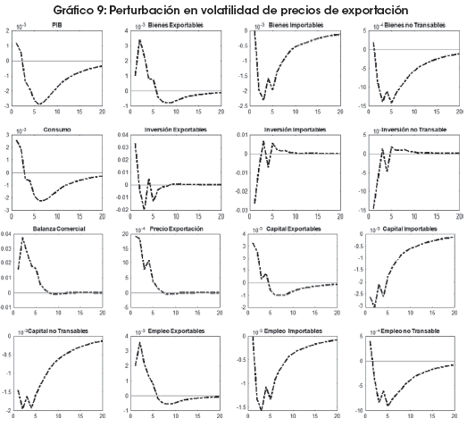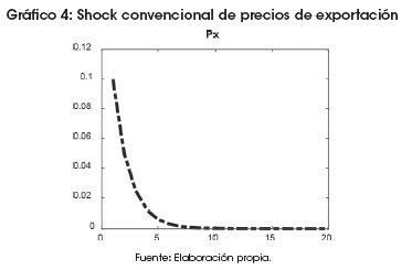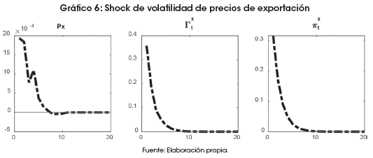 experimenta un incremento en su valor con respecto a su estado estacionario; la perturbación entra en la restricción (4) y genera un cambio en la varianza que es definido como positivo. Finalmente, el shock en precios de exportación en niveles y sobre volatilidad opera de forma paralela sobre los precios externos, generando una desviación positiva de menor magnitud que en los casos 1 y 2, pero con un tiempo de convergencia mayor con respecto al shock convencional.
