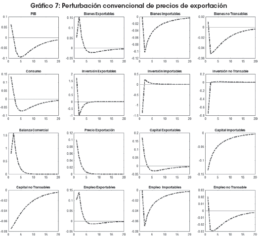 Los resultados muestran que los tres tipos de shocks generan efectos contra ciclos sobre la producción final en el mediano plazo y transferencia de factores productivos (fuerza laboral) al sector de bienes exportables. Asimismo, la incertidumbre estocástica tanto por el lado de la persistencia como de la volatilidad estocástica neutraliza parcialmente el impacto de los shocks de precios de exportación. En adición, los shocks de persistencia generan un impacto más duradero en el tiempo.
