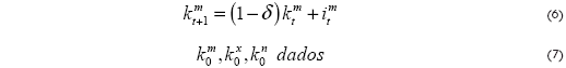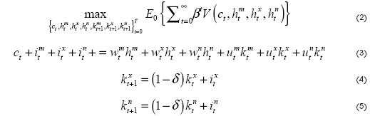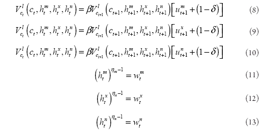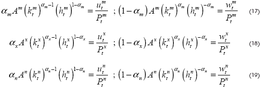 en los sectores de bienes importables, exportables y no transables, respectivamente. Se asumen tres leyes de movimiento del capital convencionales para cada sector básico de producción. De las condiciones de primer orden del problema de maximización de las familias se obtiene la ecuación de Euler y la oferta de trabajo: