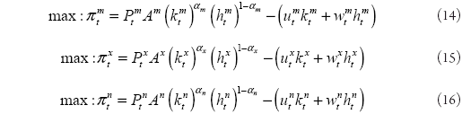 ). Se emplea una función de producción del tipo Cobb-Douglas. Estas empresas deben elegir la cantidad de capital y horas de trabajo a contratar que hagan máximos sus niveles de utilidad (