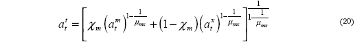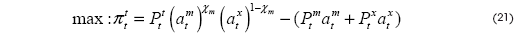 de bienes exportables, μmx la elasticidad de sustitución entre bienes exportables e importables y χm se define como la proporción del gasto en bienes importables. Sin pérdida de generalidad, se supone que μmx = 1, por lo tanto, el problema de maximización de beneficios es: