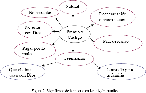 En cuanto al análisis del contenido, se considera a la muerte como premio y castigo. Se sabe que es algo natural que puede tener consecuencias positivas o negativas, según cómo haya sido la persona en vida. Por un lado, están la resurrección o la reencarnación, la paz y el descanso; y por el otro están no resucitar, pagar por lo malo o no poder estar con Dios. Está orientación se expresa en ceremonias que tienen un significado de brindar consuelo a la familia doliente o de rogar porque el alma se vaya con Dios, es decir, porque reciba un premio y no un castigo (ver figura 2).