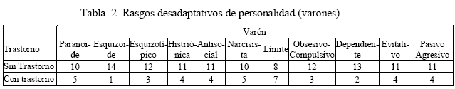 Los perfiles con rasgos desadaptativos de personalidad, paranoide-histriónico-narcisista-limite-evitativo, paranoide-obsesivo compulsivo-pasivo, paranoide-esquizotípico-antisocial-limite-pasivo agresivo, esquizoide-narcisista-limite-obsesivo compulsivo, histriónico-antisocial-narcisista-limite-evitativo-pasivo agresivo, histriónico-limite-evitativo, paranoide-esquizotípico-antisocial-narcisista-obsesivo compulsivo y paranoide-esquizotípico-histriónico-antisocial-narsisista-limite-dependiente-evitativo-pasivo agresivo, se presentan en 8 hombres drogodependientes respectivamente