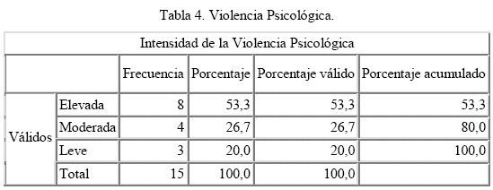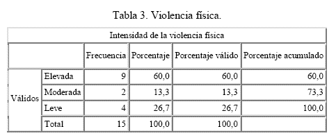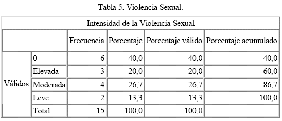 Respecto a los resultados sobre el cuestionario de violencia conyugal, estos permiten señalar que las 15 parejas evaluadas presentan violencia física (ver tabla 3) y psicológica (Ver tabla 4) y 8 parejas evaluadas presentan violencia sexual (Ver Tabla 5).
