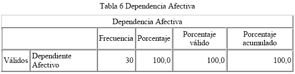 En relación al cuestionario de dependencia afectiva, los resultados son significativos, ya que el 100%, es decir las 30 personas presentan dependencia afectiva (Ver tabla 6)