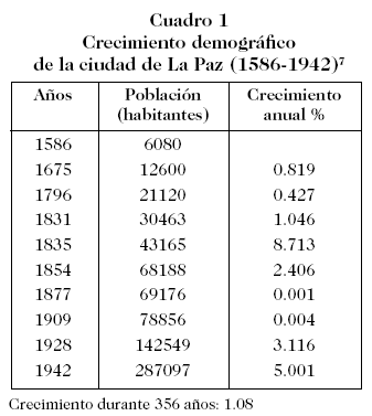 Pasados más de tres siglos y medio del empadronamiento de 1586 la ciudad de La Paz llega a tener una población 47 veces superior a la cuantificada por esta enumeración "urbana". A pesar de las apariencias esto no quiere decir mucho si notamos que estaríamos hablando de una tasa crecimiento anual, calculada para 356 años, de 1.08%. Si construimos un crecimiento hipotético sostenido desde 1586 hasta 1942 la población resultante es de 278437 habitantes; apenas un 3% menos que la población empadronada en 1942. Pero, la demostración de una tendencia modesta en el crecimiento a largo plazo no explica las fuertes fluctuaciones en el ritmo "acelerado" del incremento demográfico en el "quinquenio" de 1931-1935, tampoco la subida en el ritmo de crecimiento que se da entre los tres "quinquenios" que avanzan desde 1928 a 1942. En estos casos estaríamos hablando de la incidencia de un crecimiento social debido a la inmigración. ¿Quiénes migran? Por otra parte, lo que ocurre en la década 1835-1854 más parece corresponder a un debilitamiento del crecimiento social desatado en años anteriores. De manera opuesta, lo que pasa entre las dos "décadas" que van de 1909 a 1928 anuncia más bien un nuevo impacto demográfico debido al fenómeno migratorio, que se va a manifestar los años subsiguientes.