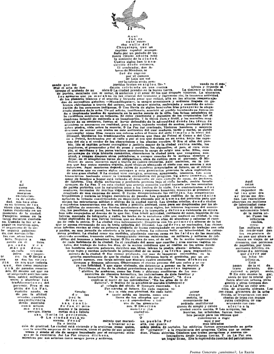 1 "Es interesante señalar, que la "ciudad", -entendida más que como un determinado sitio geográfico, como un conjunto de personas (vecinos) e instituciones (Cabildo, Iglesia, etcétera)- fue simplemente "depositada" en el asentamiento indígena de Chuquiago ya que una ordenanza del rey Carlos V sobre fundación de ciudades señalaba que estas debían ser erigidas o creadas en tierras vacantes, sin "perjudicar a los indígenas", ordenando además no desplazar a la comunidades nativas de los sitios que ocupaban". Rossana Barragán: "El Espacio Urbano y dinámica étnica". La Paz en el Siglo XIX. Hisbol; pág. 19.