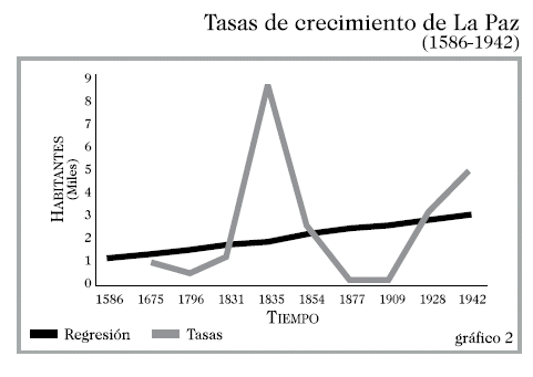A treinta y ocho años de la fundación de Nuestra Señora de La Paz, la ciudad contaba con 6080 habitantes, ciento veintiún años más tarde la población prácticamente se duplicó, pero a un ritmo promedio pobre de 73 habitantes por año. Esto quiere decir en términos de indicadores que estamos ante una tasa de crecimiento del orden de 0.83%. Después de 121 años parece disminuir el ritmo de crecimiento, la tasa de crecimiento anual resulta ser del orden de 0.43%; esto quiere decir que la población se incrementa a un promedio de 70 habitantes por año. ¿Por qué baja la tasa de crecimiento? En primer lugar no olvidemos que las dos secuencias demográficas evaluadas corresponden a dos periodizaciones desiguales; una de 89 años, otra de 121 años. Tiene que quedar claro que los magros ritmos de crecimiento no se deben a que se trata de poblaciones pequeñas; este hecho no afecta en el ritmo de crecimiento, aunque puede determinar los límites absolutos de la masa de nacimientos, como de la masa de muertes. El ritmo de crecimiento se debe a la diferencial entre natalidad y mortalidad, por un lado, y a la diferencial entre inmigración y emigración, por otro. Las bajas tasas de crecimiento nos hablan de una distancia estrecha entre nacimiento y muerte, aunque se trate de tasas de natalidad y de tasas de mortalidad altas; también nos muestra la lerda dinámica migratoria de aquella época. Treinta y cinco años después, es decir, en 1931, a seis años de la independencia, la población de la ciudad de La Paz se cuantificaba en 30463 habitantes. En otras palabras, desde 1796 a 1831 el contingente demográfico de Nuestra Señora de La Paz había crecido a un ritmo definido por una tasa de 1.05%. Esto quiere decir que se manifestó un incremento absoluto promedio de 257 personas por año. ¿A qué se debe este "salto" en el crecimiento demográfico de la ciudad? En el transcurso de estos años entre los cuales transcurre la larga guerra de la independencia y los recientes años de paz, es difícil apostar por una baja de la mortalidad. Lo más adecuado es sostener un probable aumento de la natalidad, cosa que acontece con todas las poblaciones que entrevean un mejor futuro, o que de alguna manera se ven motivadas a un incentivo en la natalidad. Otra hipótesis alternativa es la que sugiere un relativo impulso a la dinámica migratoria que tiene su centro de "atracción" en la ciudad de La Paz.