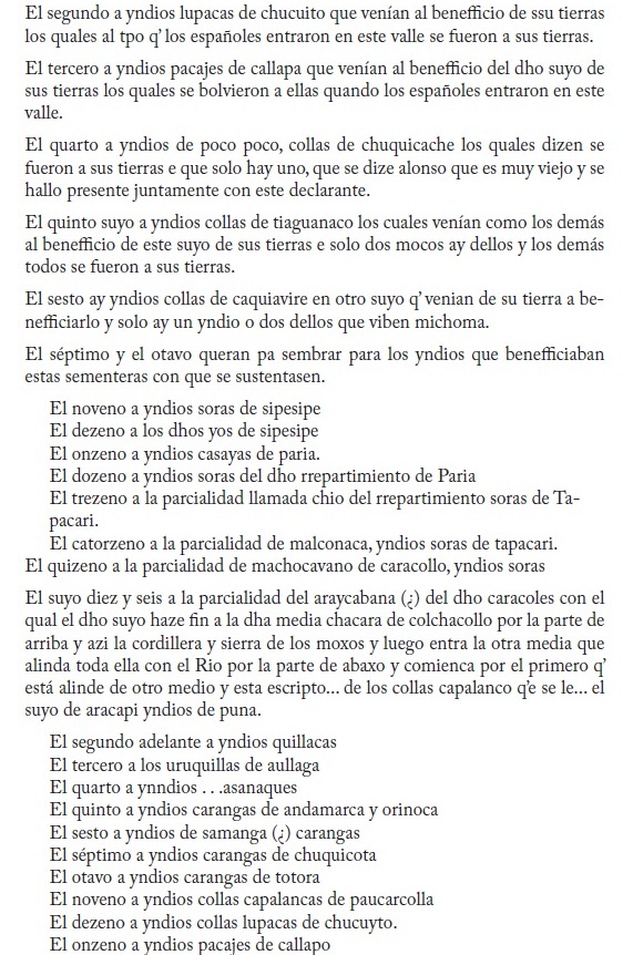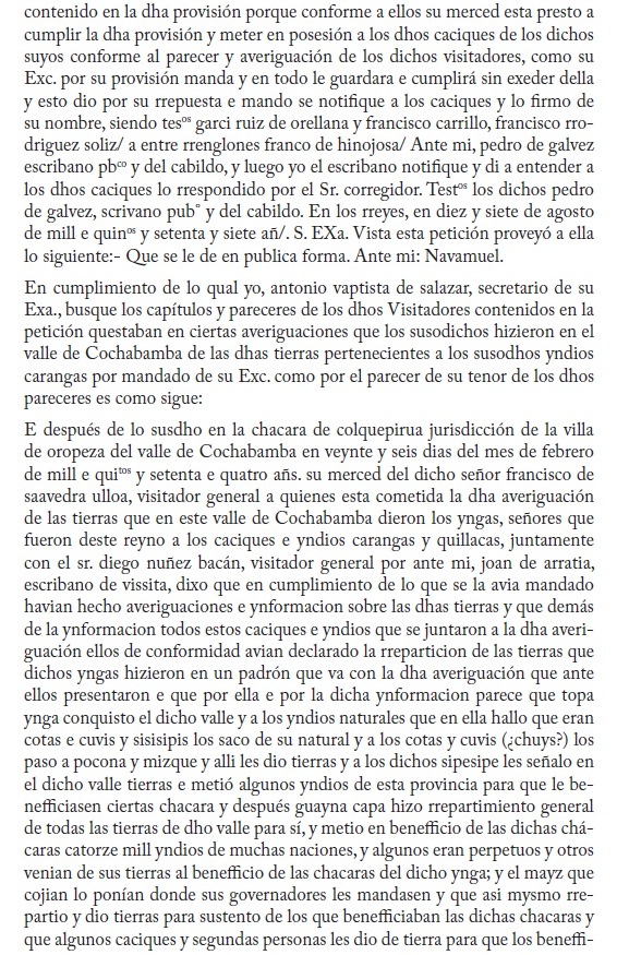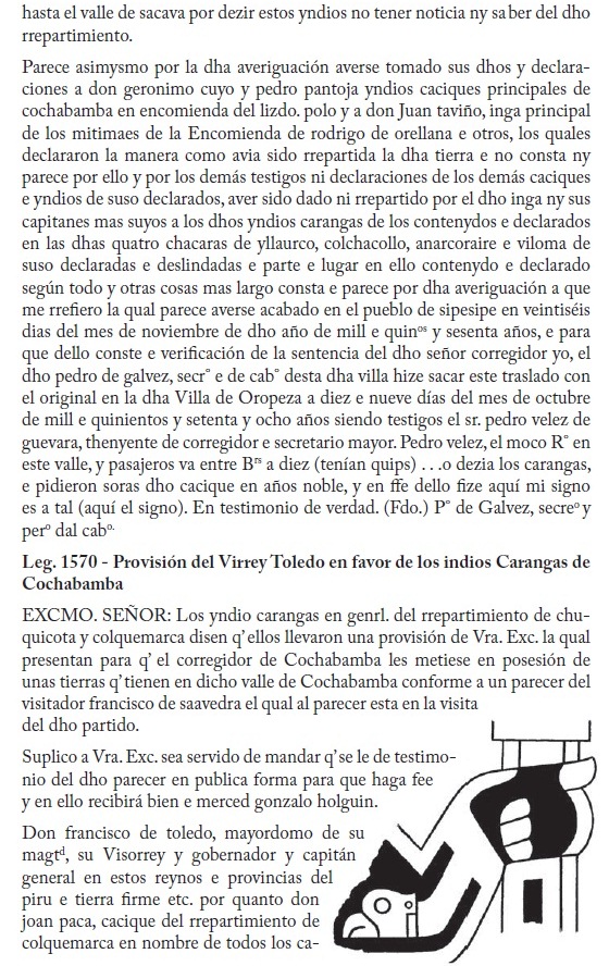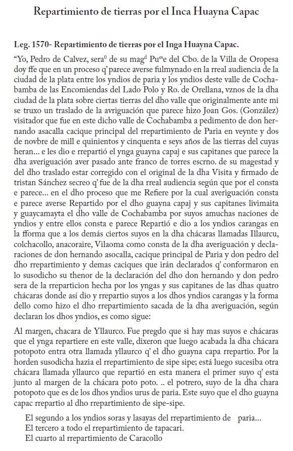 El conocido investigador de los señoríos de la región andina, Nathan Wachtel, ha revisado los manuscritos existentes en el Archivo Histórico Municipal de Cochabamba, Bolivia 1 , que es repositorio, entre otros asuntos, de documentos referidos a la administración colonial. Wachtel testifica que entre esta documentación descubrió "dos enormes legajos 2 que parecen las piezas de un proceso que oponía, en el curso de los años 1560-1570, los encomenderos del valle (Rodrigo de Orellana y el célebre Polo de Ondegardo) a los Indios Caranga, Quillaca y Sora" (Wachtel, 1981:22). En este conjunto de manuscritos, el documento más antiguo es del año 1556. Se trata del "Repartimiento de tierras por el Inca Huayna Capac", del 22 de noviembre de 1556, que se originó por un litigio de posesión de tierras (suyus) entre los indios de Paria y los del valle de Cochabamba.