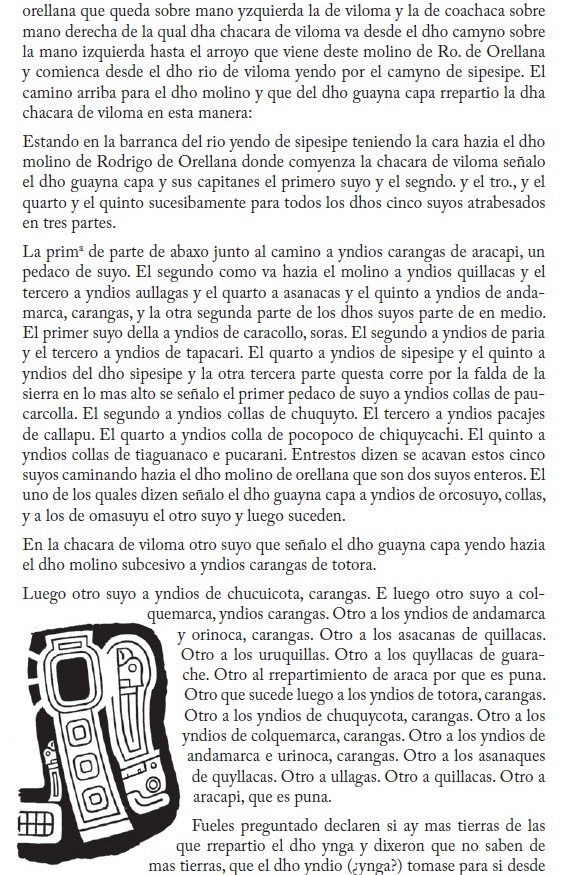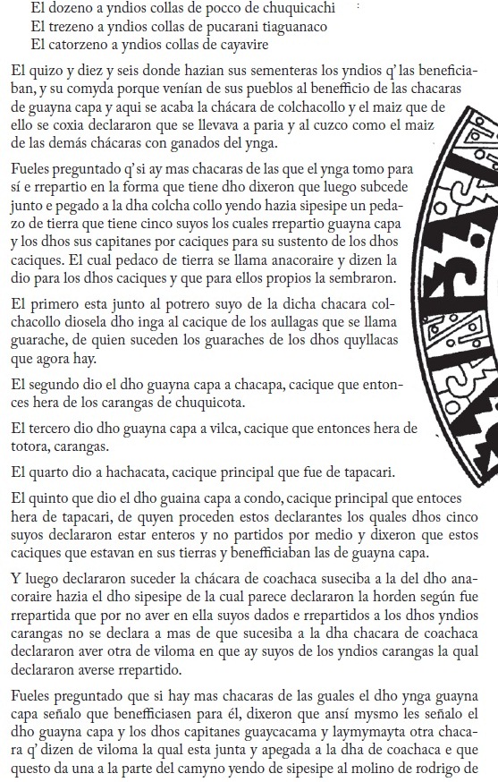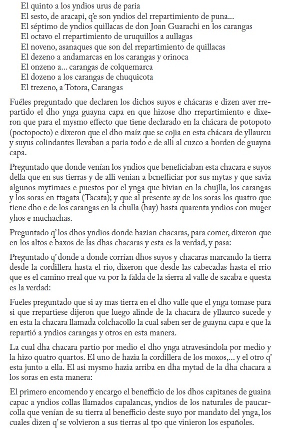 5 En su estudio del documento, Wachtel ha elaborado un cuadro en el que anota el número de suyus asignados en cada chárara. Illaurco con 13 suyus, Cochacollo con 16, Anocaraire con 5, Cochaca con 20 y Viloma con 23 (en total, 77 suyus), que multiplicados por el número de brazadas de cada suyu (44), arroja como resultado 3.388 brazadas, correspondientes a los aproximadamente más de 5 kilómetros de extensión de las tierras repartidas (Wachtel, 1981:31,33).