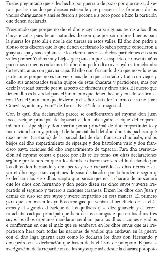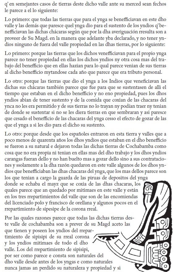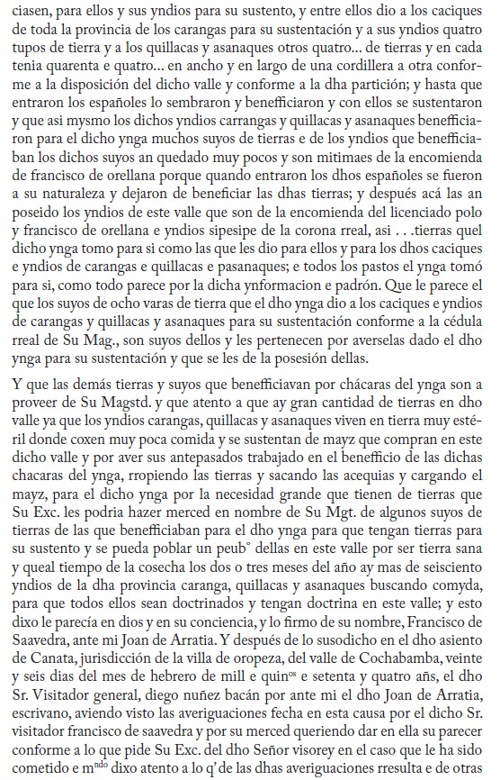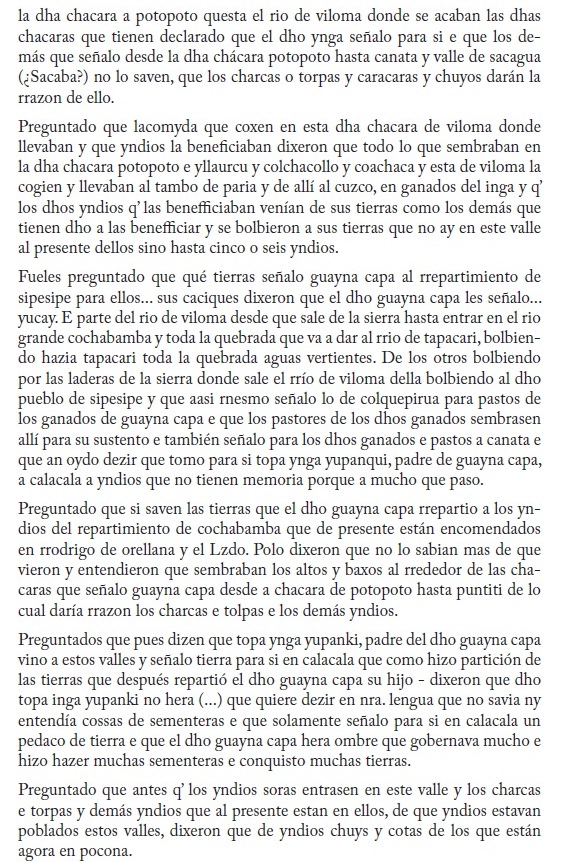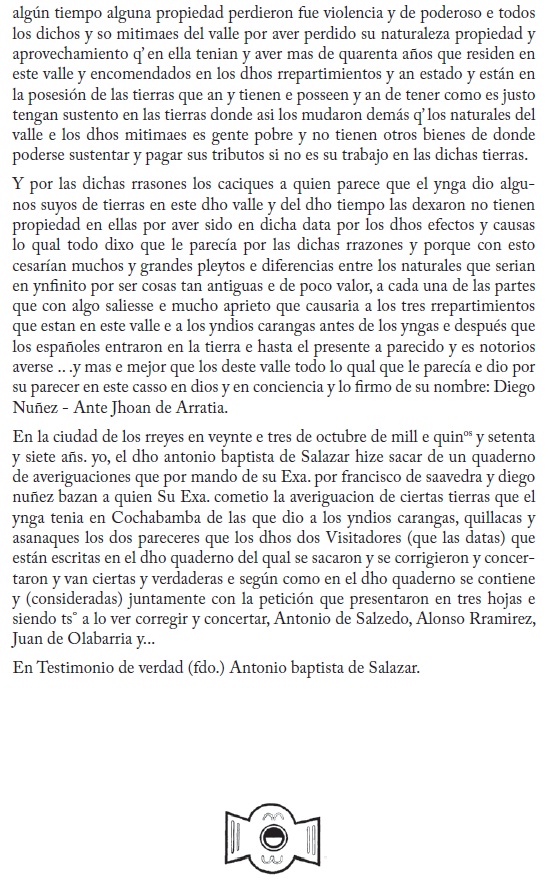 A través de un alegato judicial, este documento permite apreciar una serie de informaciones sobre el proceso de asentamiento y poblamiento de los valles cochabambinos en el último periodo de dominación incaica.