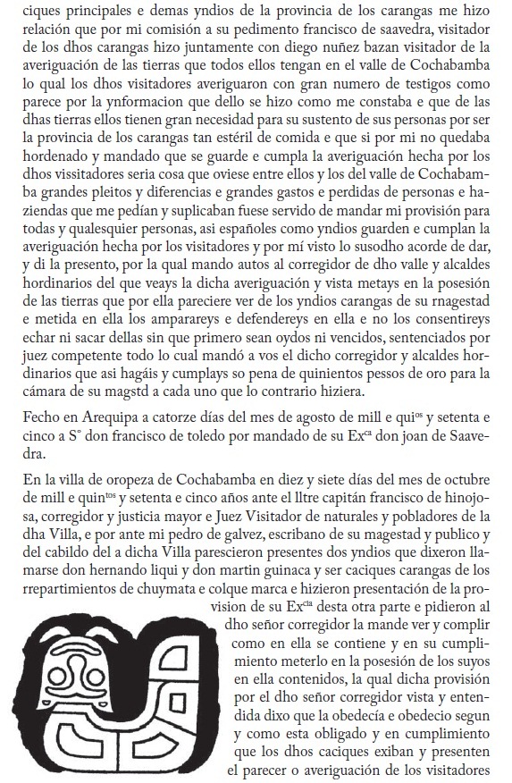 La documentación de este hecho nos introduce en aspectos históricos referidos a la presencia de los "primeros pobladores" indígenas en Cochabamba, pero también al sistema de organización de uso y usufructo de terrenos, es decir, el sistema de mitimaes. Ciertamente se pueden detectar en este litigio otros temas de interés multiétnico, etnolingüístico, productivo, etc., y que dan pie a muchas interrogantes no fáciles de ser respondidas.